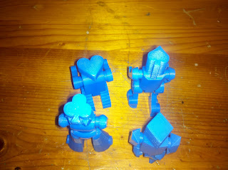 The origin of this idea was when I saw Wil Wheaton and friends play “get bit” on his web show Table Top. The game looked really cool and I thought that it would be an easy one to make printable. And since the game uses cards I’ll just take a generic robot and put a heart, club, diamond or spade on the chest. That’s when the designer in me went crazy. A month later I’ve got 4 distinct robots with interchangeable parts with designs influenced by their icon (and hiding the icon on their head).