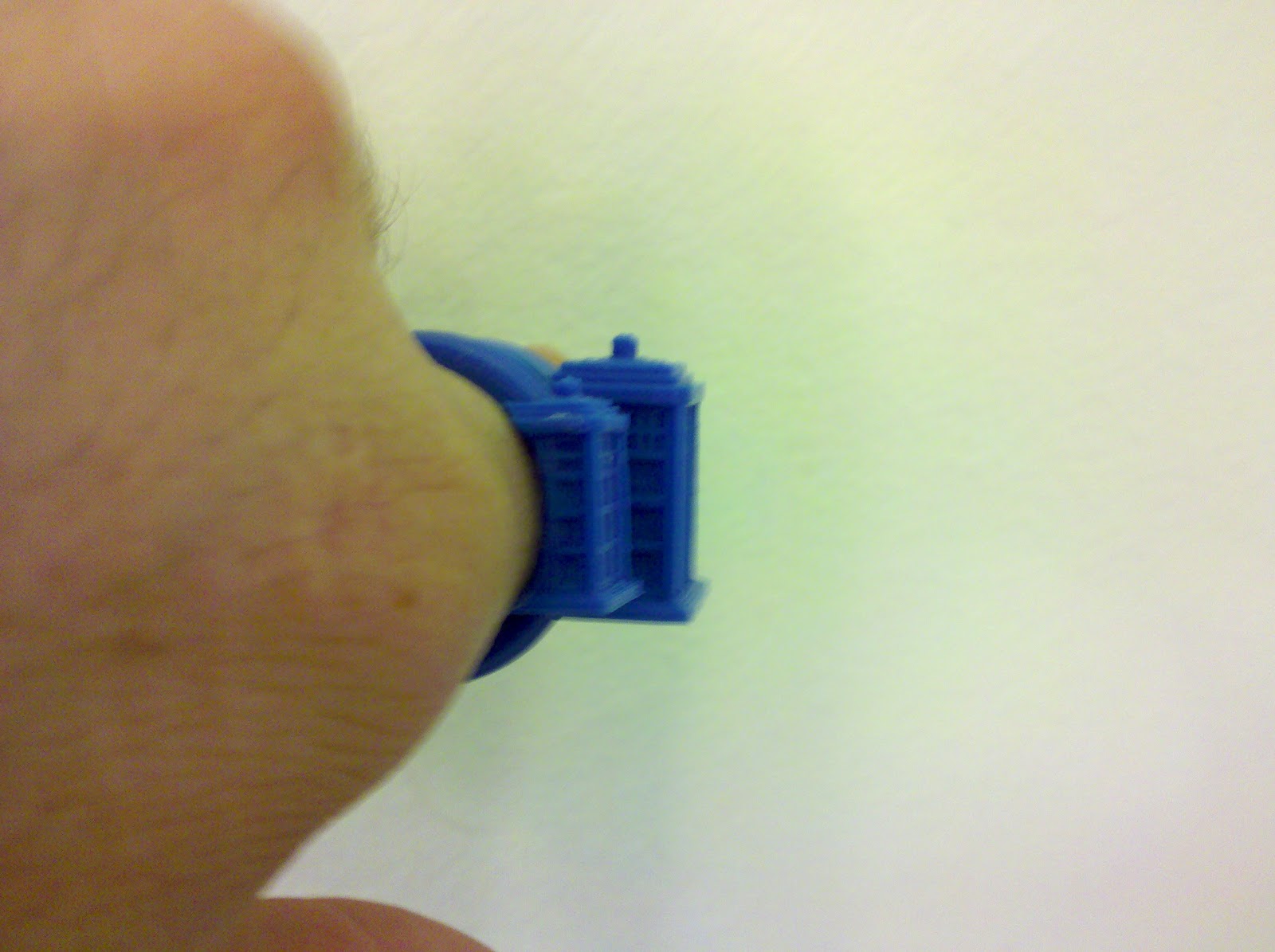 The old rings were hard to wear for everyday use, the new ones will actually let you put your hands in your pockets. The old assembly process often cracked the TARDIS resulting in a blue plastic discard bin that looks like a TARDIS graveyard, the new assembly process it’s hard to get wrong. That is why I’m discontinuing and clearancing my stock of old style rings and will only be selling the new style rings.