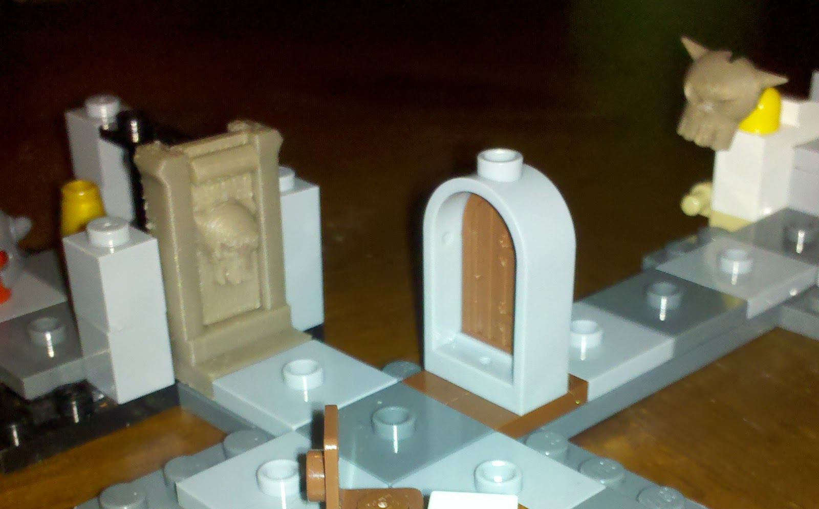 Playing Heroica we set up a board where the beginning branched to one way to a long hall of high level monsters and keyed doors, and to the other way with keys and potions. The plan was that they’d go gather the keys and stuff, then go face the boss but my most driven son decided to forego the loot gathering and charge straight for the boss, relying on perfect rolls to get through the doors and beat the monsters, and darned if he didn’t claim victory before the rest of us gathered half the things. So we decided we needed a new mechanic. A door to stop people from charging the boss. The key eventually became a switch, and I give you the Lego Heroica Boss Door.