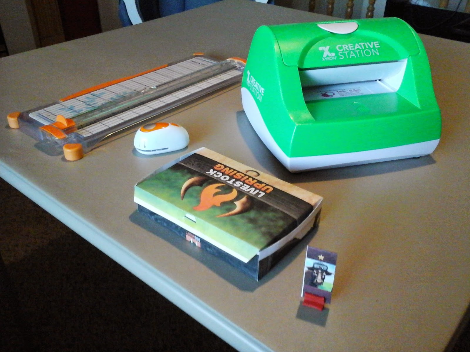 But I needed to get a few new tools to do this job (and future similar jobs). A small paper cutter, a 3/4″ hold punch, and a Xyron 5″ Creative Station laminator/sticker maker. PROTIP, sign up for Hobby Lobby’s e-mails and use their weekly 40% off coupon for that one. It comes pre-loaded with the sticker maker cartridge. I planned to using the laminator cartridge, but in a stroke of genius (if I do say so myself) sticking the board pieces back and front together made them just a little thicker than the card stock they were printed on but not too thick. I could still fit everything inside a box made from a single sheet of 8 1/2″ x 11″ paper.