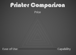 To avoid going into too much depth with my research I like to use a sort of subjective 3-axis graph system when comparing printers with “price” on one axis, “ease of use” on another and “capability” on the last.