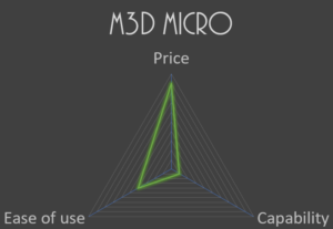 All of these review have brought to mind something I’m going to call “the Reviewer’s Dilemma”. A reviewer is beholden to 2 groups; your audience who will crucify you if you show the least amount of dis-ingenuousness, and the people who send you stuff to review who will cut you off if you are known to hurt their sales. My solution to this dilemma was to, early on, try my best to find something nice to say about every printer. This means that sometimes there are things left unsaid. For instance, I will never say that I specifically don’t recommend a printer in it’s initial review. I simply won’t say that I do recommend it, and hope that the viewer can get the meaning from what isn’t said. But that’s not always the case, as with my M3D review. In many ways this re-review is a license to be as honest as I want to be and say what I want to say, because I’ve done what I needed to with the initial review, and chances are the 3D printer suppliers are no longer watching. And if they are, and they don’t like what I have to say, well, they should be a bit more competitive in the field they want to succeed in.