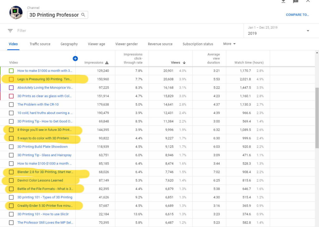 This is 2019 views list with the videos I made in 2019 highlighted. YouTube really does give some excellent tools for analyzing the statistics on videos. Of the top 10 videos, only 3 were made in this year. In one way of thinking, this is good. I always focus on evergreen content, and clearly I’ve been succeeding. But on the other hand, it’s difficult for me to make new content with the thought in the back of my mind that if I stopped producing content my channel would be just fine. The thought that this video that I’m working on isn’t going to make that big an impact on the success of my channel. And that way lies a slump. Is this what others call “burn out”? I don’t feel burnt out, per se, I just feel like I’ve got other things I want to do with my time that might have greater impact on the world.